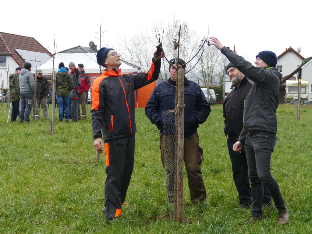 Unter Anleitung von 6 Fachwarten wurden in Kleingruppen insgesamt rund 40 Bäume geschnitten. Dabei hatte jeder Teilnehmer die Gelegenheit selbst die notwendigen Pflegemaßnahmen an einem Jungbaum unter fachlicher Anleitung durchzuführen.