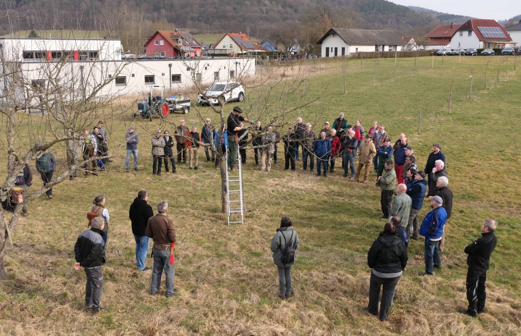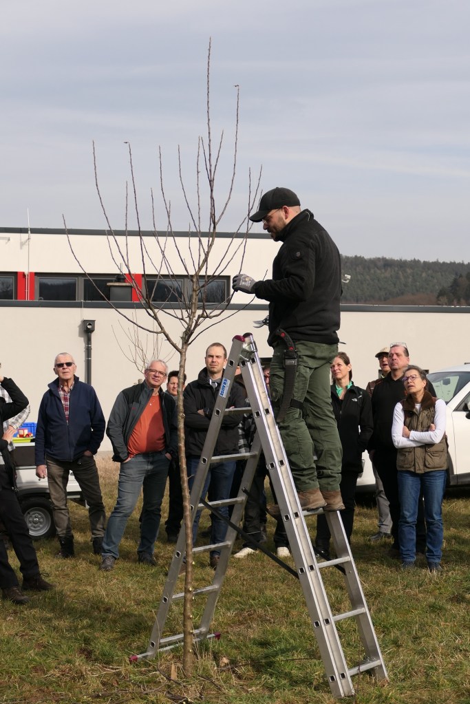 Bei frühlingshaften Wetterbedingungen trafen sich am 22.Februar 2025 rund 50 Ineressierte zum Winterschnittkurs an Obstbäumen.