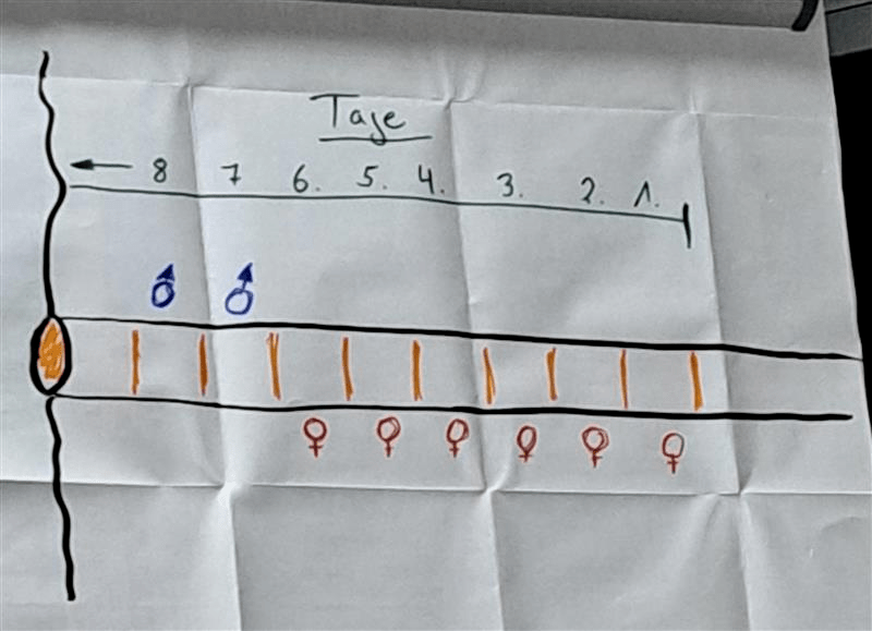 Die Mauerbiene legt immer 8 Kinderzimmer an. Dazu geht sie rückwärts in das Schilfröhrchen und legt ganz hinten ihr erstes Ei ab. Nun fliegt sie los, bringt eiweisreichen Pollen als Vorrat mit, fliegt erneut los, sucht Pflanzenmaterial oder Lehm um das Kinderzimmer zuzumauern. Am nächsten Tag wiederholt sie das Ganze Procedere. Die ersten 6 Eier sind immer weibliche Nachkommen, die vordersten 2 immer Männchen. Zum Schluss lässt sie einen Flur zum Ausgang hin stehen, praktisch ein 9. Kinderzimmer ohne Ei, um Fressfeinde wie den Specht zu täuschen. Dann verschließt sie auch dieses Loch und beginnt ihre Arbeit von neuem. Aus diesem Grund ist es extrem wichtig, dass alle Nisthilfen mindestens 13cm tiefe Löcher aufweisen. In Ihrem Leben kann sie so 5 Gänge anlegen, bevor sie abfliegt (stirbt). In der Regel überleben 3 Tiere pro Nisthöhle aufgrund von Parasiten- oder Pilzbefall, Fressfeind oder zu frühes „aufräumen“ im Garten. Peter Siebert meinte hierzu, vielleicht findet man hier einen Kompromiss, indem man trockenen Stängel abschneiden, diese dann allerdings bündelt und in eine trockene Ecke stellt, bis die Brut geschlüpft ist. Also, wenn von unten die neue Pflanzen nachtreiben. Eine Überlegung ist es auf jeden Fall wert.