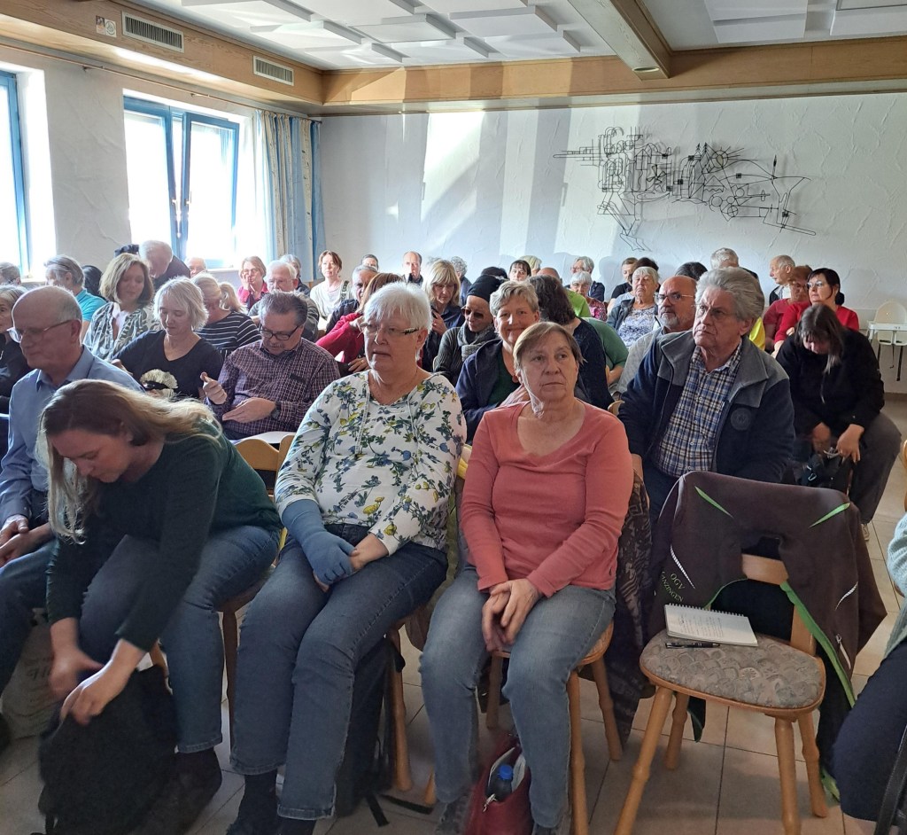 Die Anwesenden erfuhren, dass es bei Rosen alle Farbnuancen gibt, nur kein stahlblau oder reines schwarz, dass die Größen von 30cm bis über 10m reichen und es nur eine Einzige Ernte – im Oktober- gibt. Kletterrosen sind öfter blühend, können nicht selber stehen und müssen angebunden werden. Ramblerrosen sind einmal blühend und so wuchsstark, dass der Nachbar auch noch etwas von Ihnen haben wird. Das sollte man beim Kauf unbedingt beachten meinte Hr. Stroh. Wichtig ist bei allen, dass die Veredelungsstelle mindestens 5cm tief im Boden eingegraben wird, also konträr zum Pflanzen eines Obstbaumes. Neben Strauchrosen gibt es einmal blühende Wildrosen mit typischem Wildrosenduft. Hier lässt man die Hagebutten stehen, wenn man im Folgejahr wieder eine Wildrose haben möchte. Weiter ging es zu Bodendecker, Zwergrosen, Englischen Rosen und Edelrosen. Hr. Stroh erklärte, dass von 100000 Hagebuttensamen in mehreren Jahren nur 10 Sorten zum Verkauf kommen. Das Rosen, die duften anfälliger für Krankheiten sind. Die Rosen natürlich auch zu verschiedenen Zeiten duften, was man beim Schneiden für die Vase beachten sollte. Die Knospen öffnen sich nur dann, wenn mindestens 1 Blütenblatt absteht. Eine geschlossene Knospe bleibt geschlossen. Es wurden Bilder von gebänderten Rosen und bunt gestreiften gezeigt. Es gibt zur Zeit fast 20000 Rosensorten.