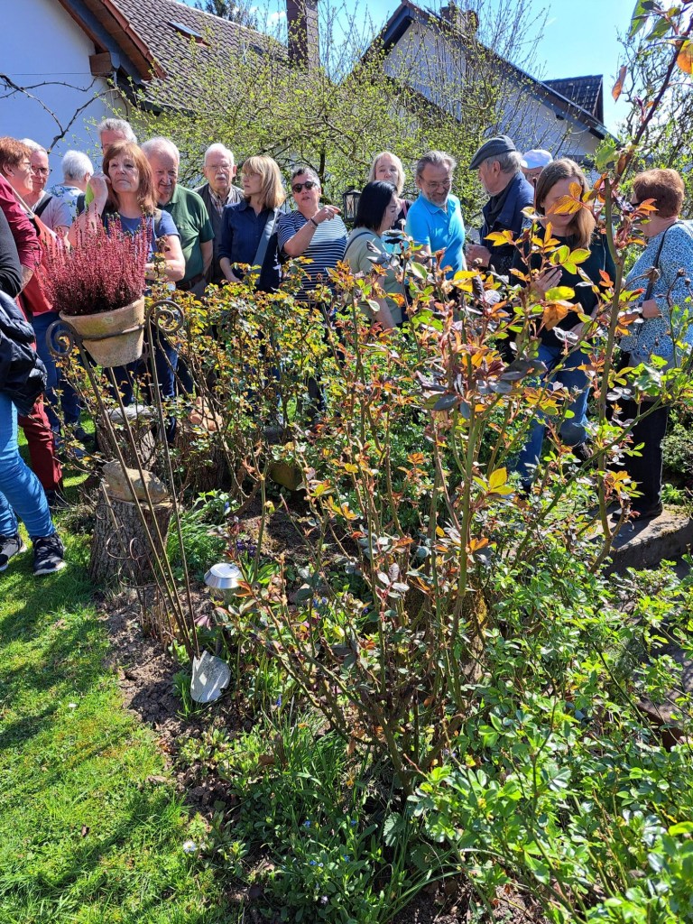Nach einer Stärkung mit Kaffee und Kuchen wurde die Gruppe praktisch unterwiesen. Hierzu ging es in den privaten Garten des Vorsitzenden Dieter Kilgenstein.