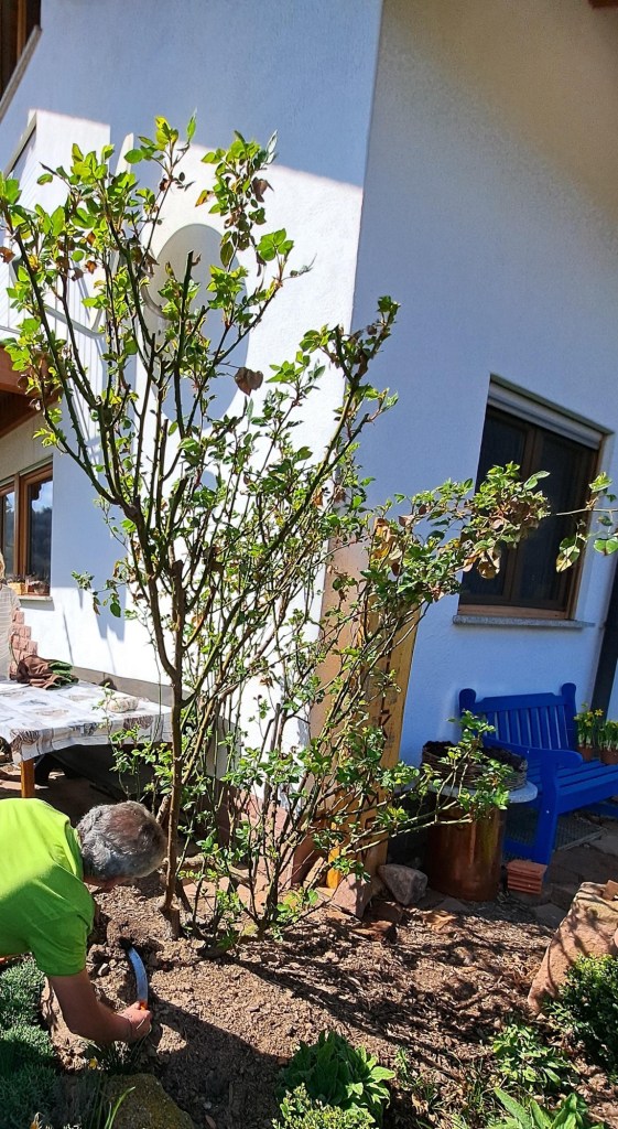 Herr Stroh erklärte den Anwesenden, dass alle bereits „so schön ausgetriebene“ Rosen in diesem Sommer blühen werden, weil ein starker Rückschnitt ein starker Austrieb folgen wird. Es war sehr interessant und wieder lehrreich und machte Mut, es im eigenen Garten sofort umzusetzen. Es gab noch Unterlagen zum Nachlesen und einige Blätter aus dem Buch „Homöopathie für Rosen“ von Christiane Maute, erschienen im Naranya Verlag.