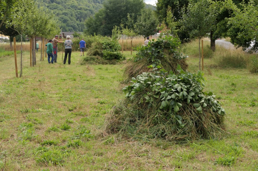 Nachdem das „große Heu“ mit Traktor, Wender und Rundballenpresse bereits gemacht war, galt es im Bereich der Obstbäume und Wiesenränder pflegend einzugreifen.