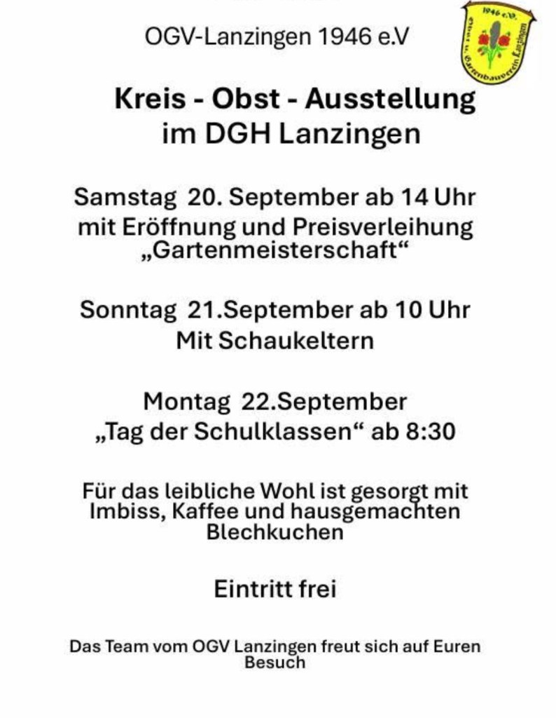 In der Zeit vom 20. bis 22.09. findet in Lanzingen die diesjährige Kreisausstellung des „Kreisverband Gelnhausen zur Förderung des Obstbaues, der Garten und Landschaftspflege im Main-Kinzig-Kreis“ im Dorfgemeinschaftshaus (Stegwiesenweg 6) statt.